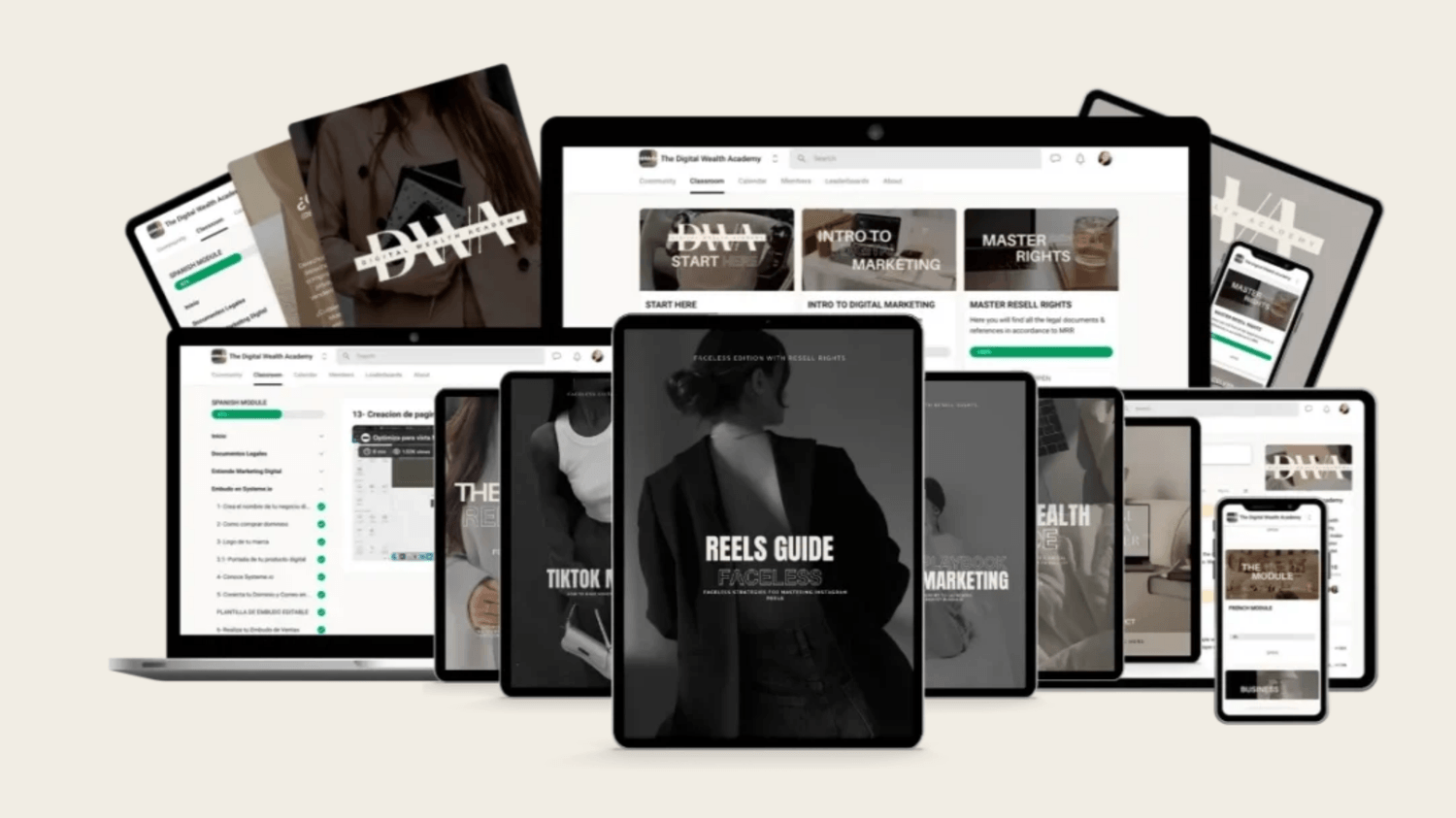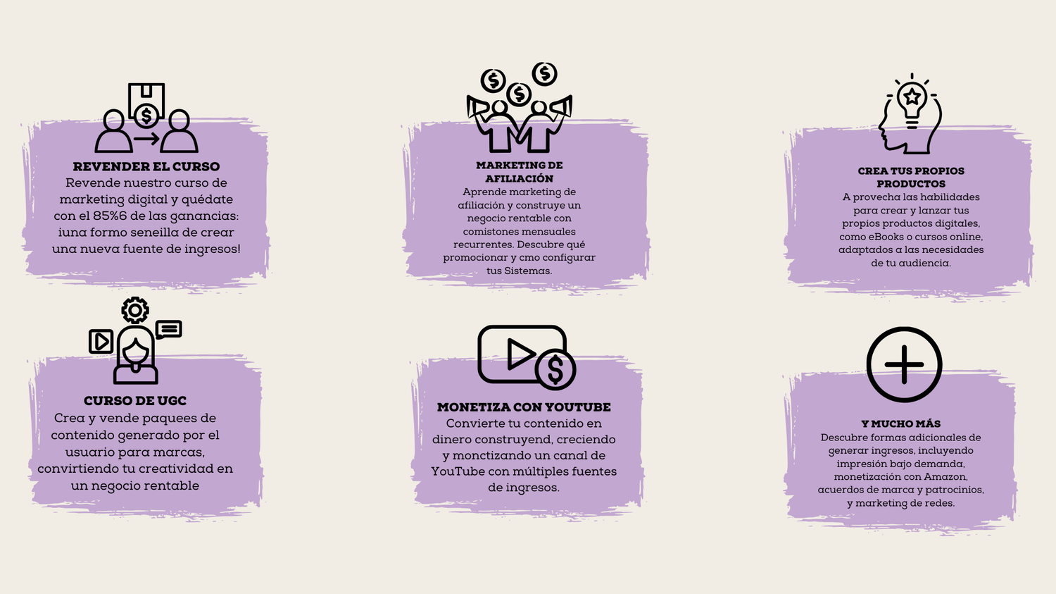 Este producto es un curso paso a paso de marketing digital. Tiene 80 módulos con más de 100 videos que te ayudarán a crear tu propio negocio de marketing digital. Además, una vez compras el curso también adquieres los derechos de reventa (MRR en inglés) y lo puedes vender las veces que quieras y quedarte con el 100% del dinero.