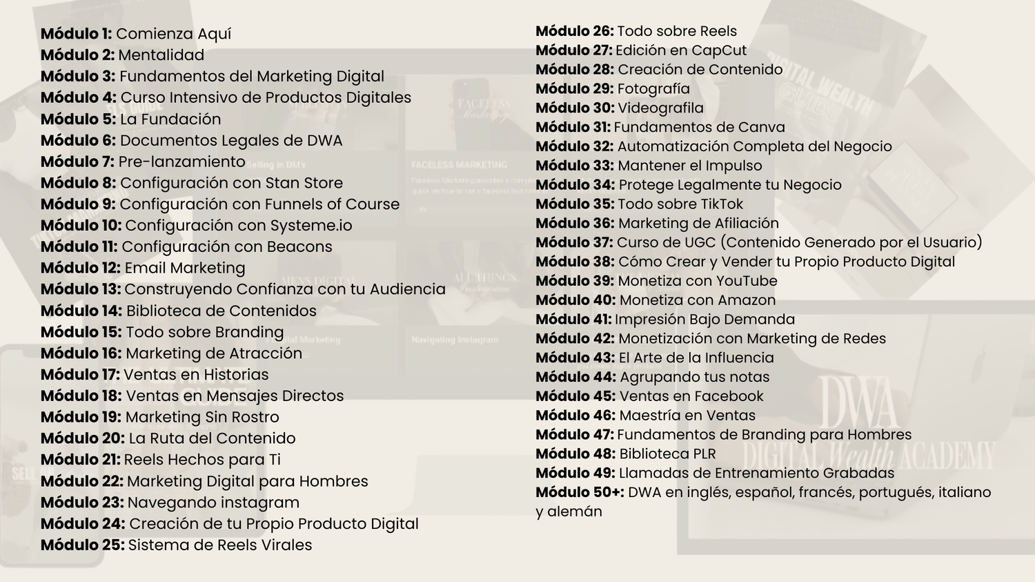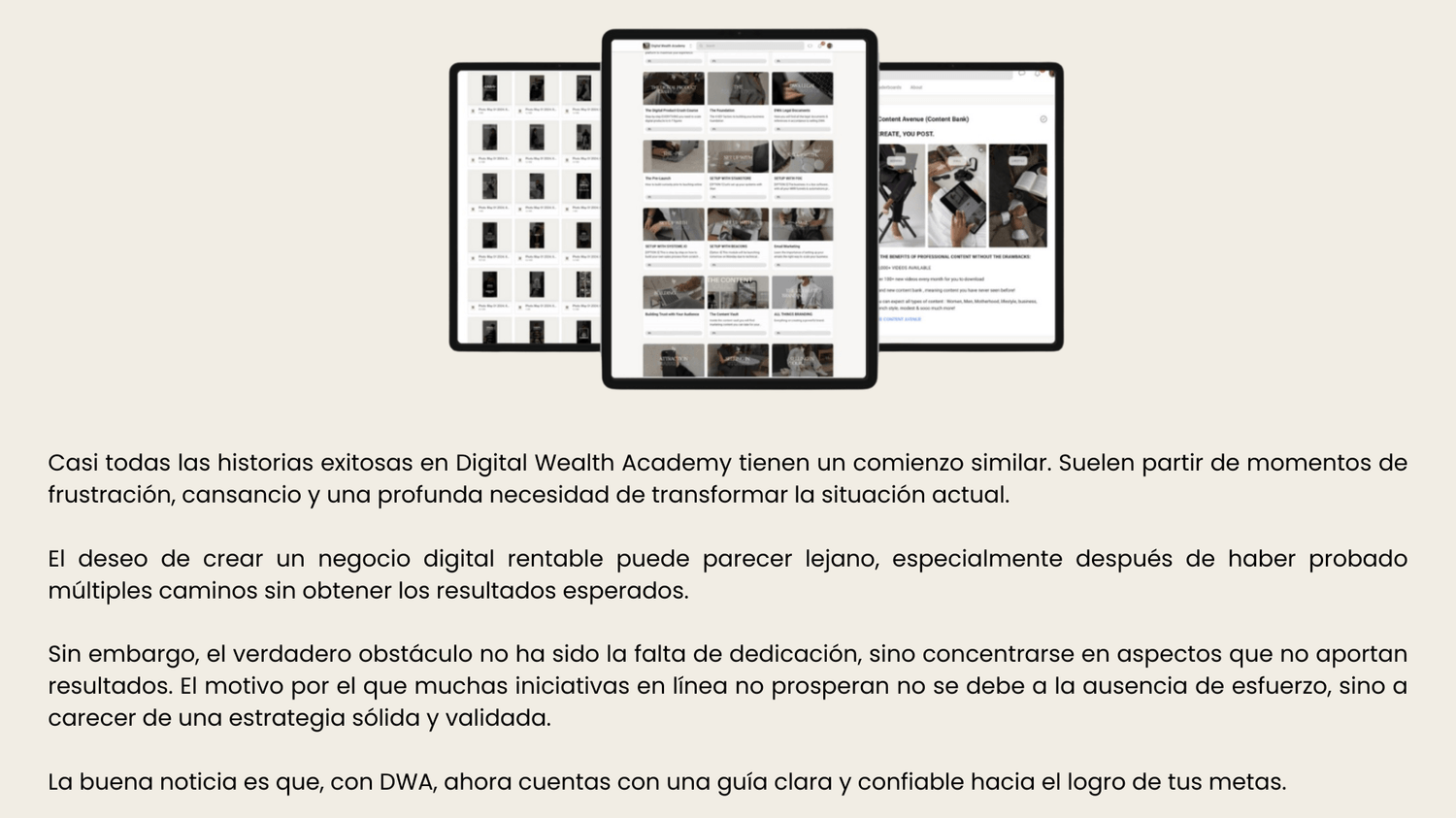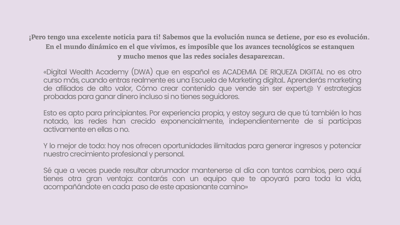 AL UNIRTE A DWA, NO SOLO ADQUIRIRÁS CONOCIMIENTOS EN MARKETING DIGITAL; TAMBIÉN TENDRÁS ACCESO A DIVERSAS ESTRATEGIAS PARA GENERAR INGRESOS EN LÍNEA Y CREAR UN NEGOCIO SOSTENIBLE Y ESCALABLE